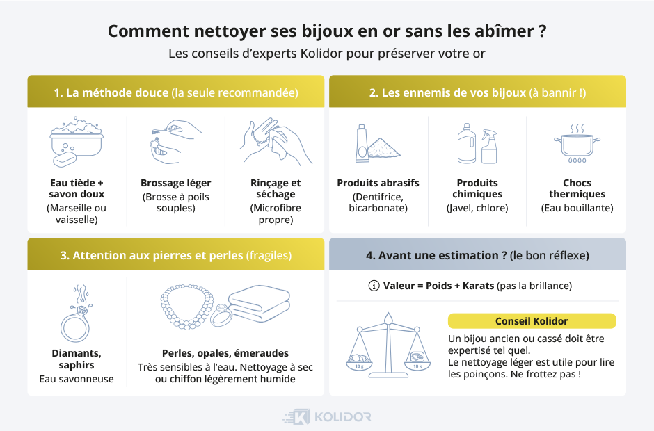Lorsqu’il s’agit de nettoyer l’or, la règle d’or — justement — est la modération. Inutile de chercher des solutions complexes ou radicales : dans la grande majorité des cas, un nettoyage simple et délicat suffit amplement à raviver l’éclat du bijou sans prendre le moindre risque.