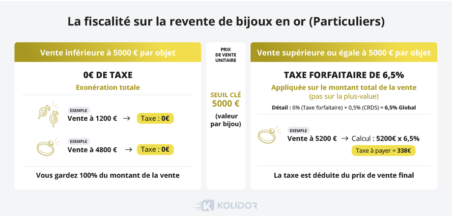 Si vous vendez un bijou en or au-dessus de 5 000 €, l’État prélève une taxe forfaitaire de 6,5 % (6 % + 0,5 % de CRDS).