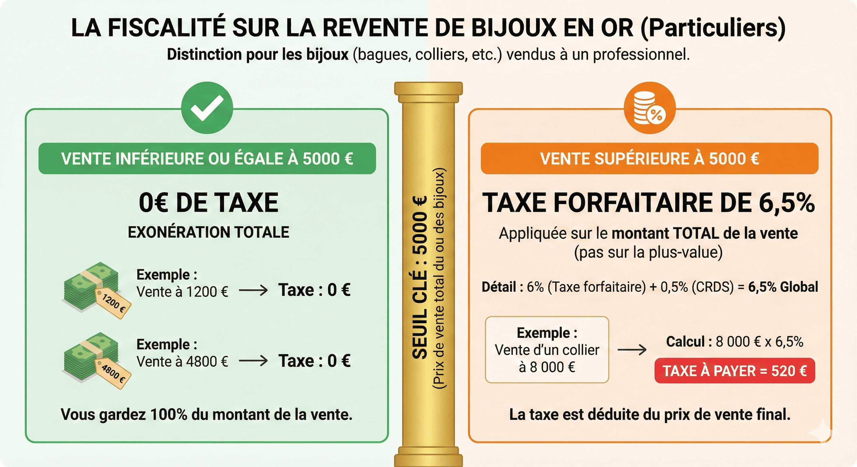 Si vous vendez un bijou en or au-dessus de 5 000 €, l’État prélève une taxe forfaitaire de 6,5 % (6 % + 0,5 % de CRDS).